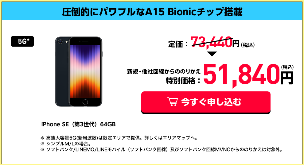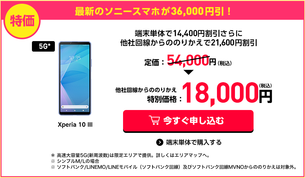 ※ソフトバンク・LINEMOまたはソフトバンク回線を利用した格安スマホ・格安SIM通信事業者からの乗り換えは対象外となります。