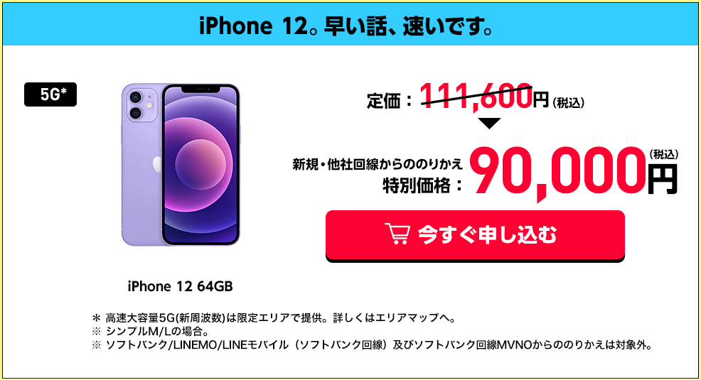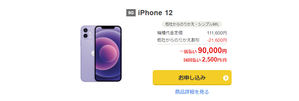 iPhone12を111,600円から21,600円割引きの90,000円で提供しています。