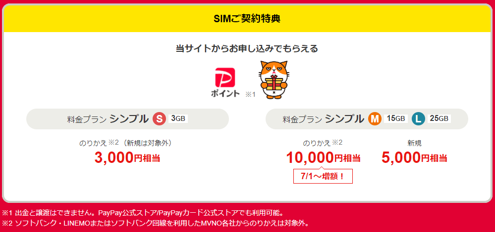 SIM単体契約では他社からの乗り換えで「シンプルS」(3GBで2,178円)の場合、PayPayボーナス3,000円相当が付与されています。