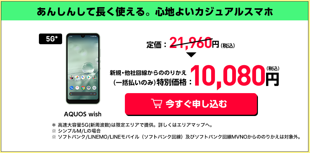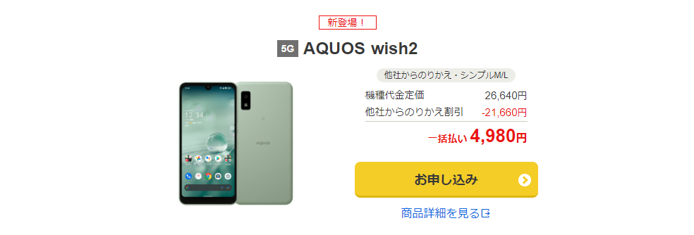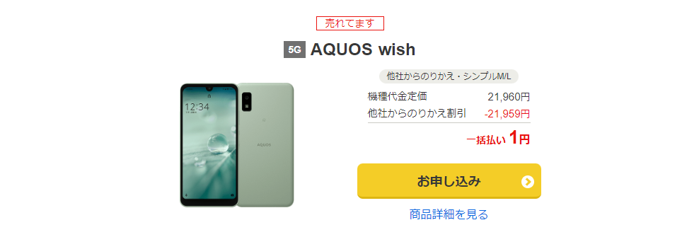 ここでは竹野内豊と志尊淳のテレビCMでおなじみのAQUOS wishが他社からの乗り換え・シンプルM/Lプラン限定で1円で購入できます。