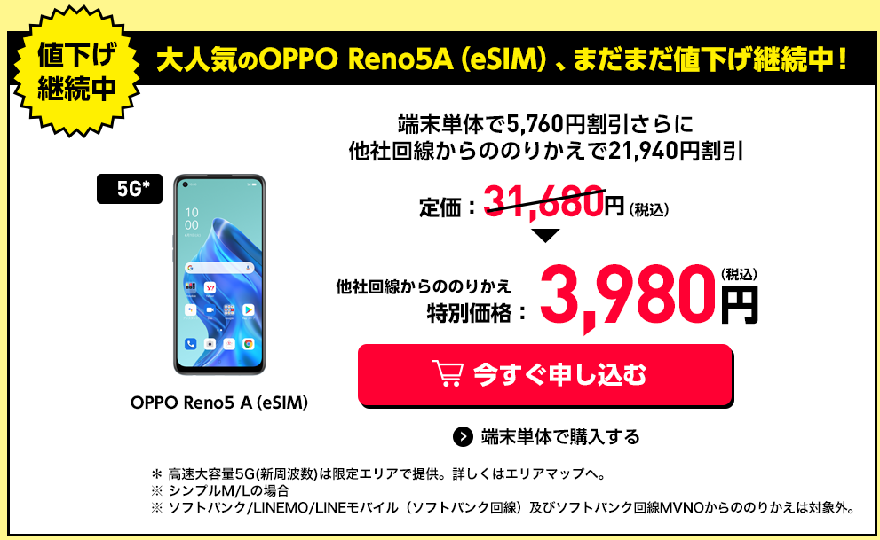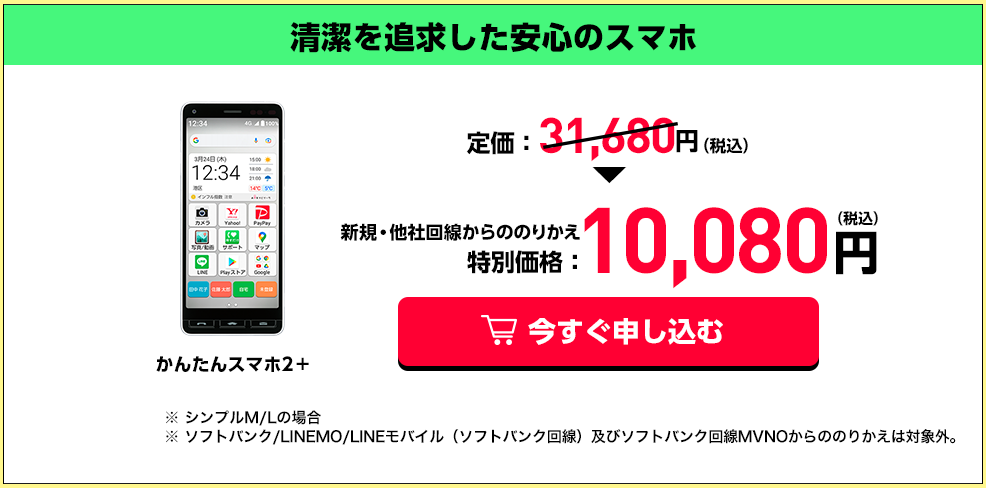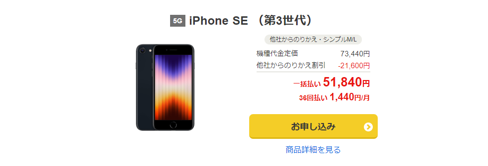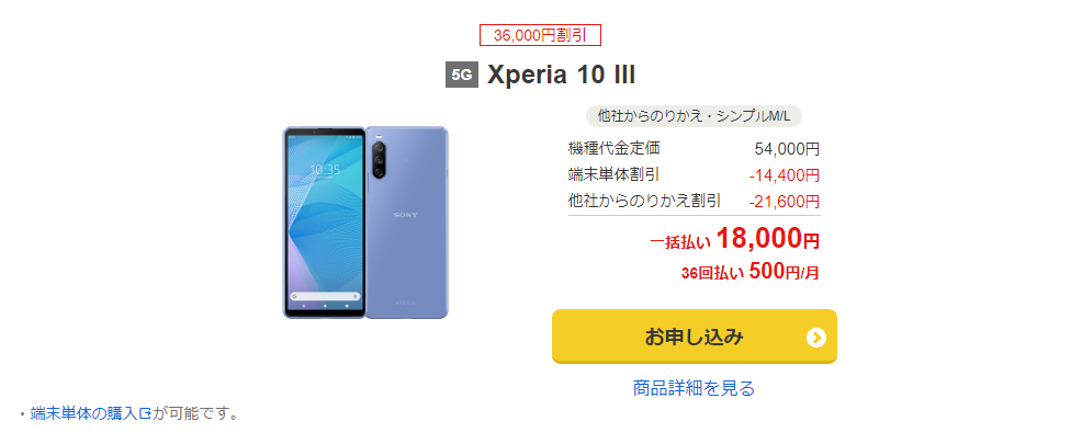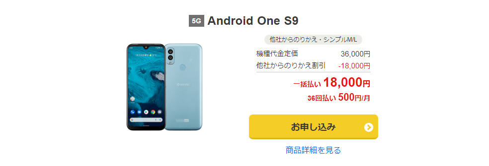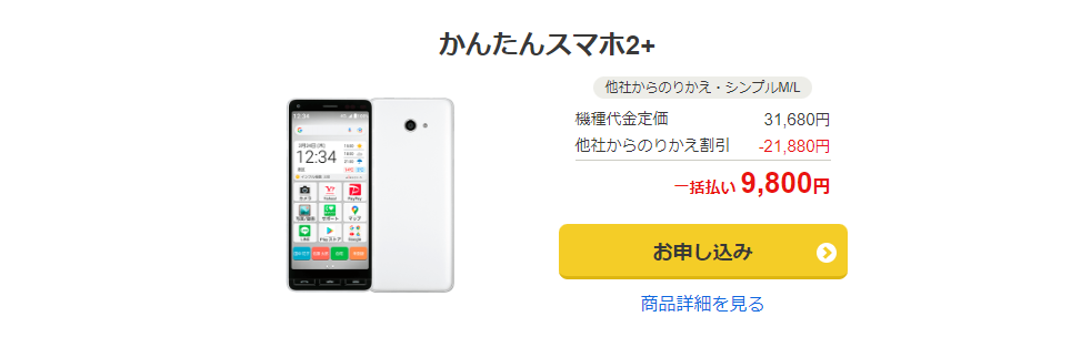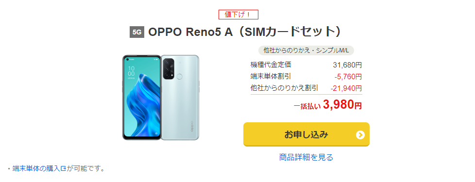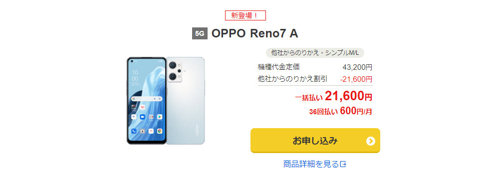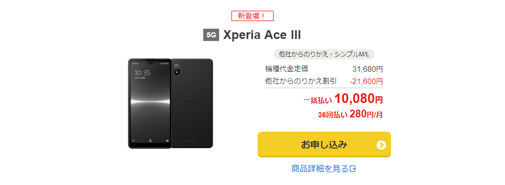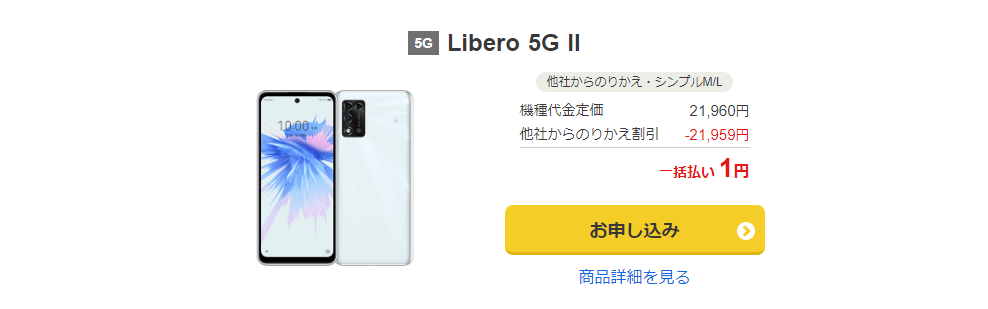 この機種は他社からの乗り換えでシンプルM/Lプランならいつでも1円なので、急に乗り換えが必要になってもあんしんの価格設定です。