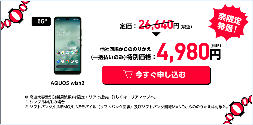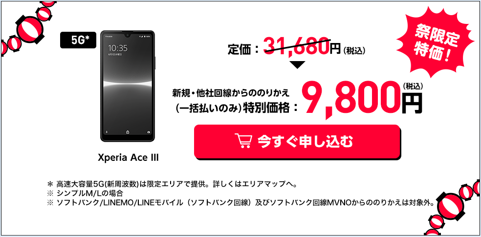 現在開催中の大特価セールは「ワイモバイル祭大特価」です。